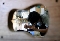 ![]() 幼少期の私は、友達と野球をしたり、遊んだりする時以外は大半の時間をギター工場内をうろついたり、ゴミ箱からのTone Woodのはしくれで工作を楽しんでいました。 私の伯父は岐阜県で世界的な有名なギター工場を営んでおり、父はその工場のチーフクラフトマンとして世界中のミュージシャンのカスタムギターを2002年までの42年間手掛けてきました。 父はウイークディのみならず、週末も工場でギターを製作していたので、私も一緒に出かけて自分の身長よりも大きいアコースティックギターを眺めながら、日本の「のこぎり」や「かなづち」を使って工作をしていました。 17歳の頃の私は、音楽に夢中になり、私の興味は「ギタリスト」、「ギター」に注がれ、それと同時にその仕事に関わっている父親を深く尊敬するようになりました。 20歳の時に、伯父の仕事に付き添いとして初めてロサンゼルスに訪れた時の衝撃はすざましいものでした。雑誌、CDでしか知らなかった世界を実体験したのですから・・・。 文化、食べ物、言葉全てに感銘を受けた私は「いつかノースアメリカに住んでみたい」と思うようになりました。 大学を卒業した私は、一般企業に就職し、サラリーマンの道に入りました。 しかし既にギター、木工に興味があった私は「後悔のない人生を送りたい、自分自身の夢を実現したい」という思いがだんだんと強くなり、仕事が休みの週末には伯父のギター工場の一角で木工作業を始めるようになりました。 しかし最初から私の父は楽器を作ることを許してくれず、木工機械を触ることでさえできませんでした。私に与えられたのは「ワークベンチ」と「のこぎり」、「のみ」、「かんな」などの伝統的な道具だけでした。 豪華なギター用材料(マホガニー、ローズウッド、スプルース)の切れ端を使って、鉛筆立て、宝石箱、まな板、下駄などいろいろな物をハンドツールのみで製作しました。今振り返ると、この頃の経験が今の私の製作スタイルに役立っていると感じます。 ハンドツールの使い方をマスターした私は、生涯初の楽器製作を始めました。完成した時の興奮と喜びは、今でも忘れません。これを機に私は勤めていた会社を辞め、楽器製作者として生きる決心をしました。